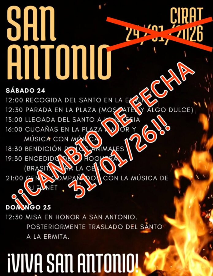 El día 31 se realizará la quema de las hogueras por la celebración de San Antón, se colocarán dos hogueras, una en el Barrio Alto y otra en la Plaza Mayor.